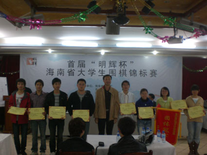 2010年12月28下午四点半,为期三天的海南省“明辉杯”大学生围棋锦标赛在304永利集团官网入口邵逸夫交流中心落下帷幕。下午五时,颁奖典礼在304永利集团官网入口邵逸夫交流中心隆重举行,304永利集团官网入口副校长、海南省围棋协会副主席林强、省围协副主席兼秘书长张劲海、省计生委书记周公卒等领导参加了此次颁奖典礼,林强副校长为此次锦标赛致辞。