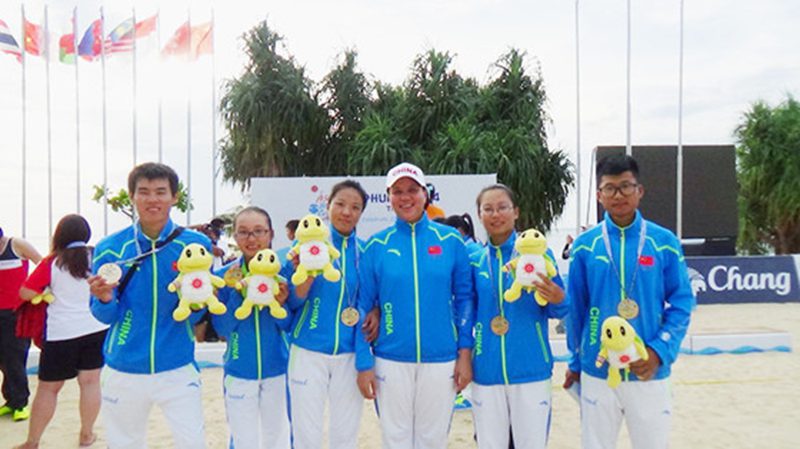 2014年11月11日至21日,第四届亚洲沙滩运动会在泰国普吉岛举行,共有来自42个国家和地区的2600余运动员在此同场竞技。此次比赛中国代表团共派出196名运动员参加,其中木球代表队20人,我校有6名师生光荣入选。体育部王晓青老师任本次中国木球代表队教练,其他5名队员分别是信息学院的教师王萍、农学院的学生朱晓静和周毅、环植学院的学生兰秋、材化学院的学生谭明洋。他们分别参加了杆数赛团体和个人比赛。在比赛中,队员们不畏困难,顽强拼搏,发挥自己的水平。最终,大家不辱使命,分别取得了杆数赛女子团体和男子团体第三名的佳绩,为国家、学校争得了巨大的荣誉。