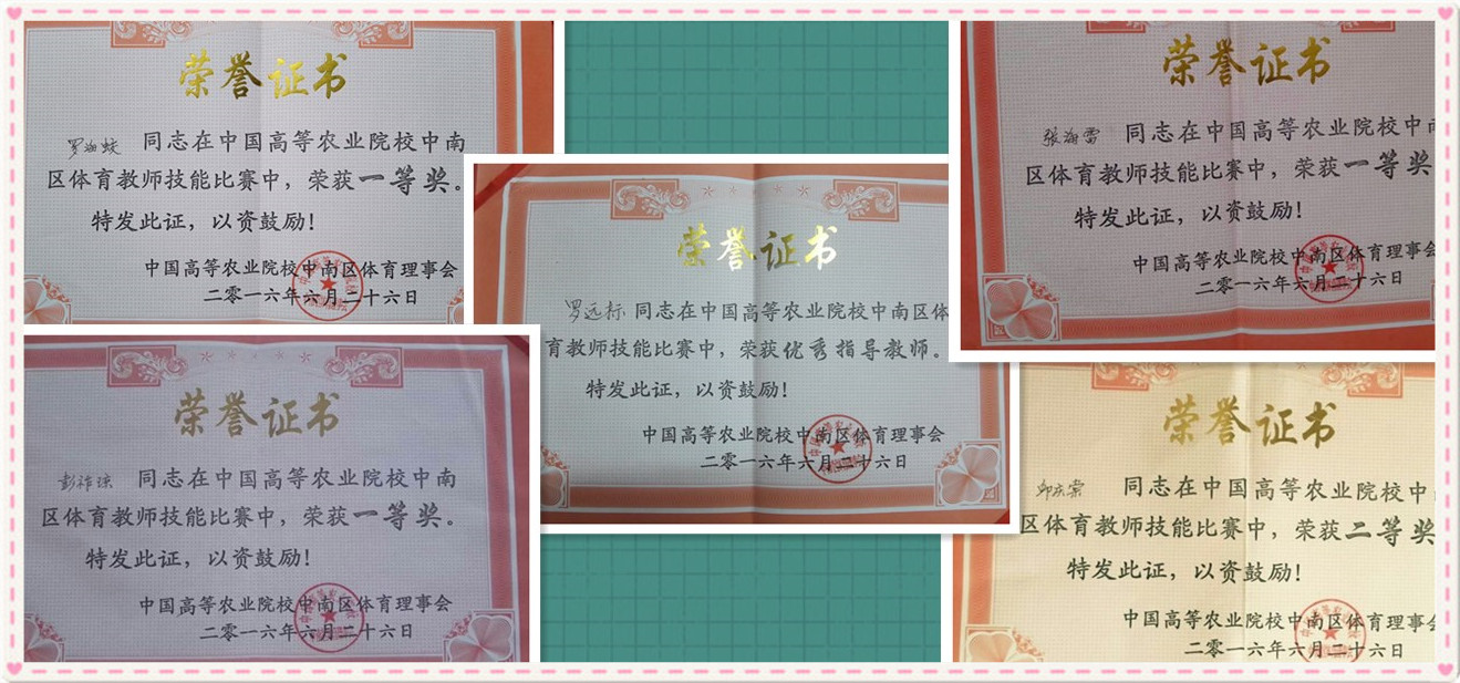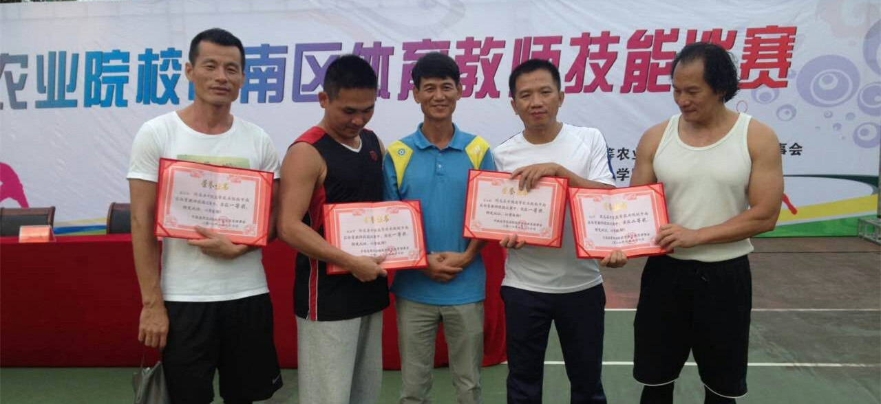 2016年6月25日-26日,由中国高等农业院校中南区体育理事会主办的中国高等农业院校中南区体育教师技能比赛在河南信阳农林学院进行,共有304永利集团官网入口、华南农业大学、华中农业大学等11所高校106名教师参加比赛。我校体育部教师罗海蛟、张海雷、彭祚琼分别荣获足球、篮球、排球项目一等奖,邱庆堂荣获篮球项目二等奖,罗远标主任荣获优秀指导教师奖,为我校争得了荣誉。
