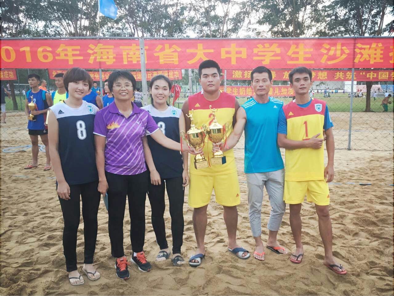 2016年海南省大学生沙滩排球锦标赛近日在琼海市海桂学校落下帷幕。我校男女沙排在专业组比赛中顽强拼搏,充分展示了我校运动健儿良好的精神风貌和精湛的战术水平,最终我校男队组合(曾繁刚、刘陶欢)和女队组合(杜星、贾凡)分别以全胜的战绩获得了本届比赛专业组男女冠军。