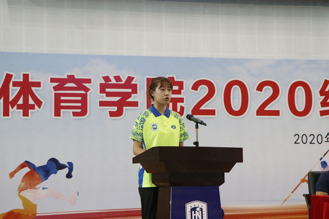 19级学生代表吴嘉骐同学发言,她结合自身一年的大学生涯向新生们分享了几点感触:如何为体育学院的美好明天贡献一份力量如何学会自立自强、如何加强自我管理能力,如何更快的融入集体生活。最后,她向新同学传达了我们海大人自强不息的奋斗精神及海纳百川的胸怀和良好的道德修养。