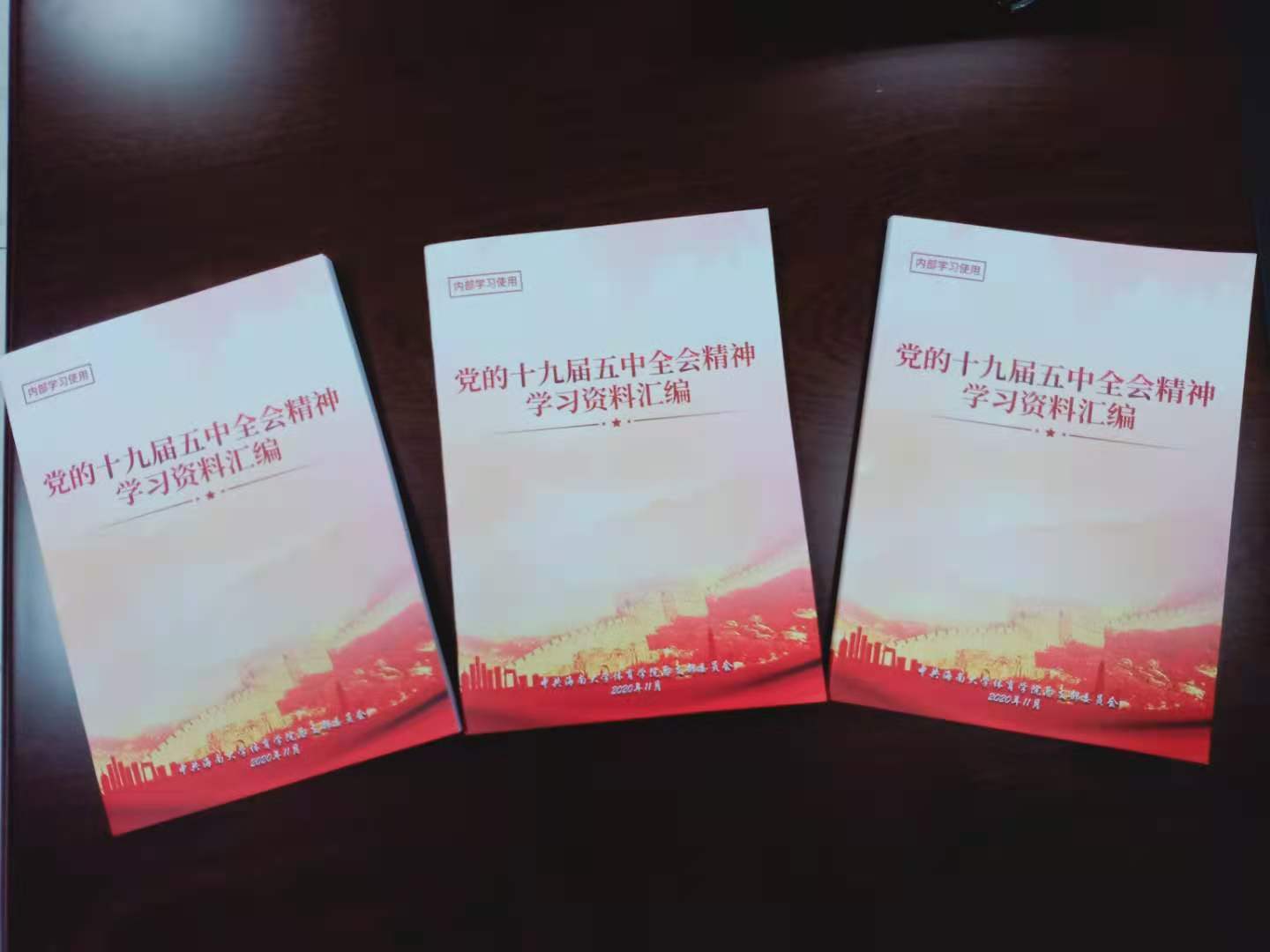 专题辅导报告结束后学院特印制《党的十九届五中全会精神学习资料汇编》,全面解读党的十九届五中全会精神,供学院全体学生学习参考,并深刻领会全会精神。