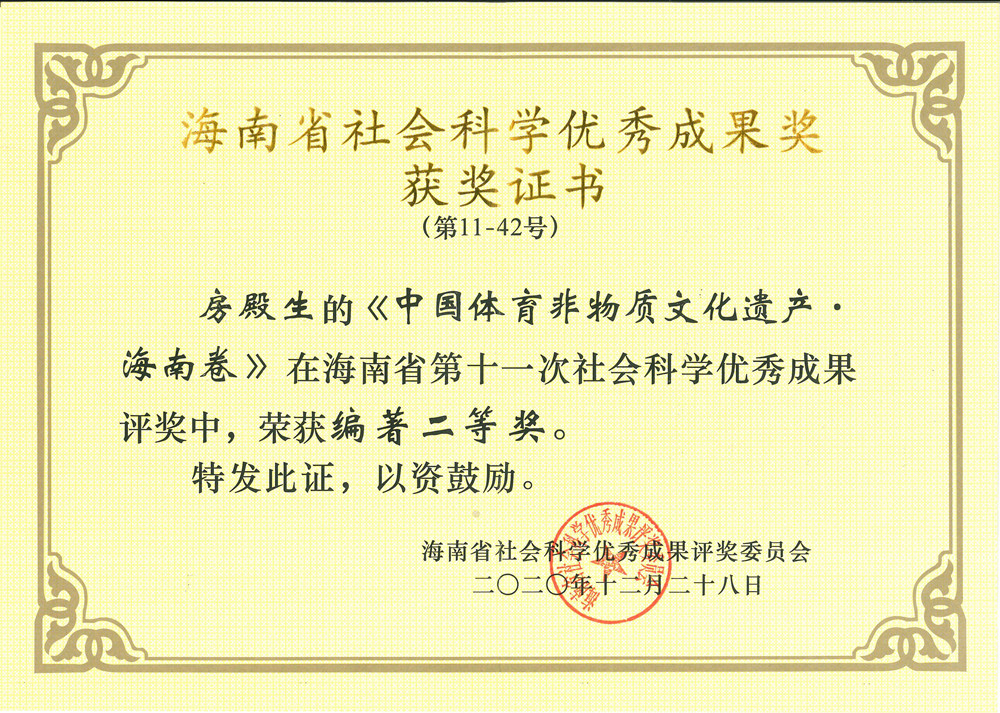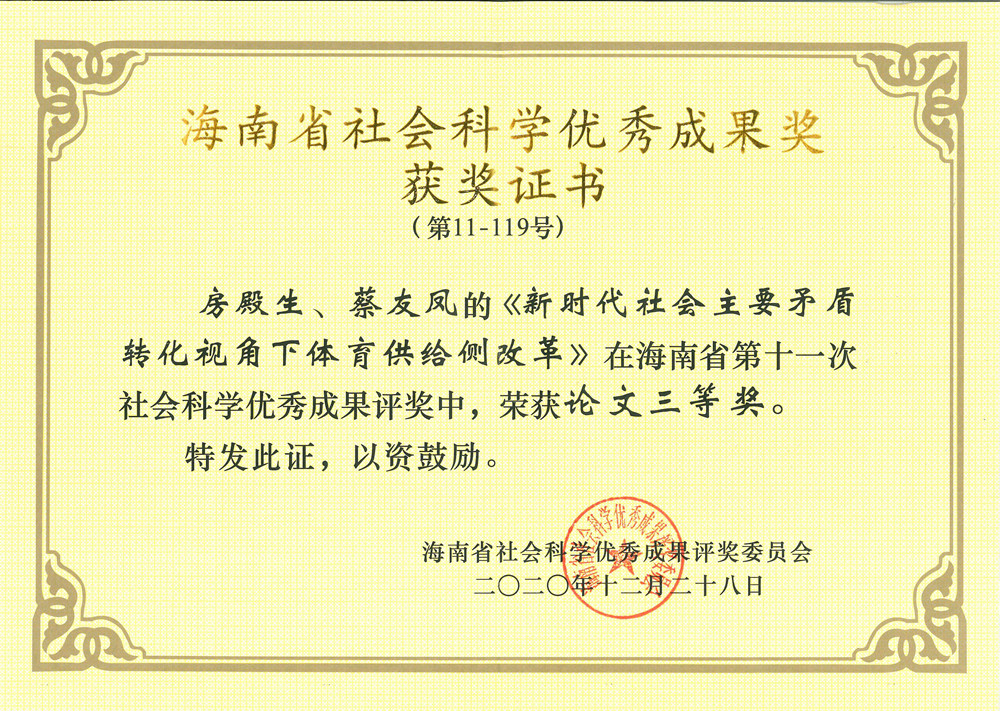 2021年1月20日,第十一次海南省社会科学优秀成果奖颁奖大会在海口召开。永利集团官网老师房殿生获2项优秀成果奖,其中,《中国体育非物质文化遗产·海南卷》获编著类二等奖;《新时代社会主要矛盾转化视角下体育供给侧改革》获论文类三等奖。