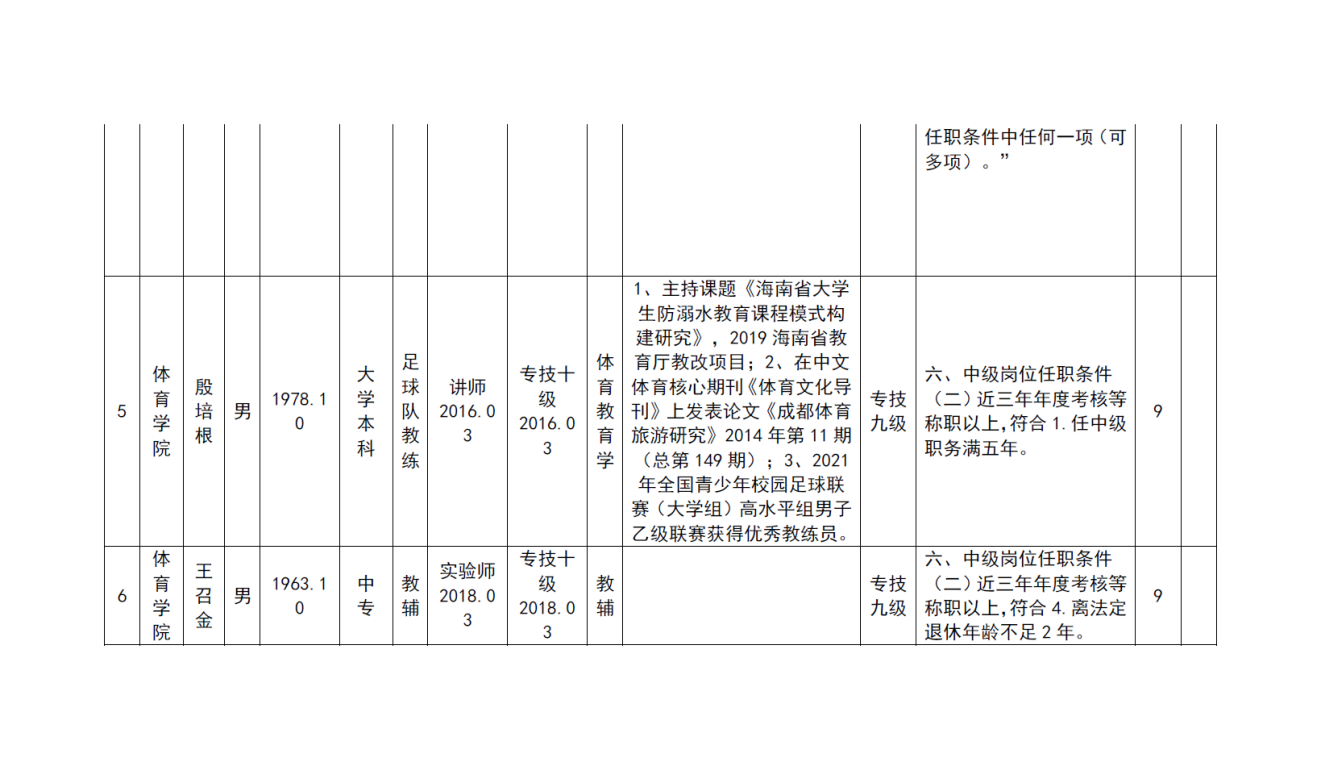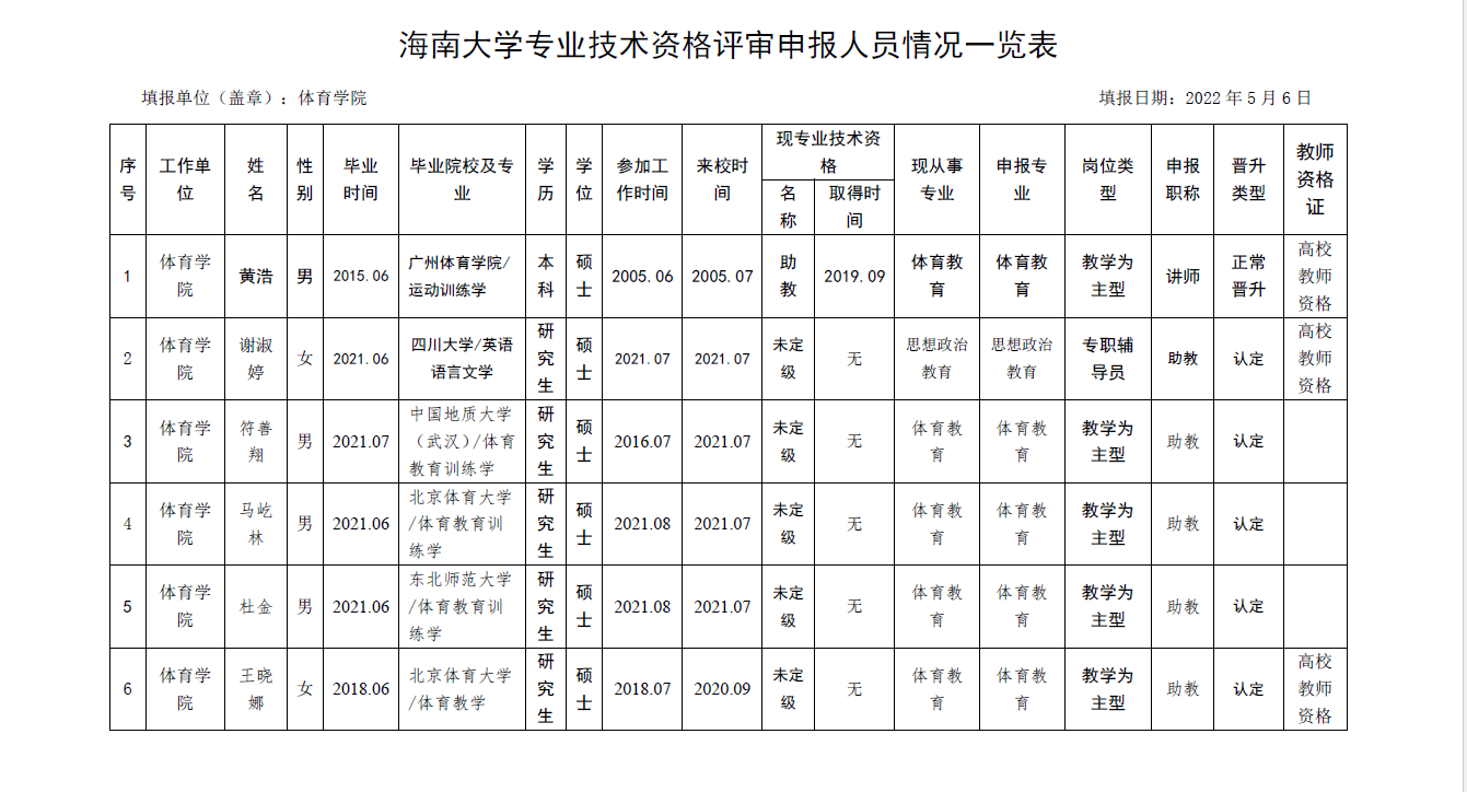 根据《海南省人力资源和社会保障厅关于我省事业单位岗位设置管理有关问题的通知》(琼人社发[2013]54号),《304永利集团官网入口岗位设置及聘用方案(修订)》(海大[2020]103号)等相关要求,由教职工本人申请,共有6名教师提出2022年度专业岗位聘用申请、10名教师提出专业技术评审和认定申请, 学院基层评审委员会审核,并票决全部通过。具体名单如下: