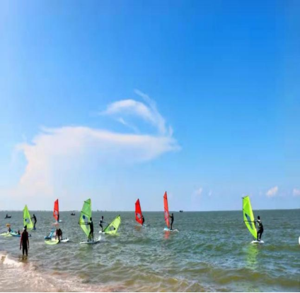 西秀海滩阳光普照,天气晴朗,椰林洒绿,海风习习。碧蓝的海水映照蓝天白云,金黄细软的沙滩上聚集前来交流切磋的体育爱好者。帆船帆板运动员扬起风帆,按照既定路线在海面竞相追逐,给西秀海滩增添了活力和缤纷色彩,吸引了众多当地群众和旅游者前来观摩。